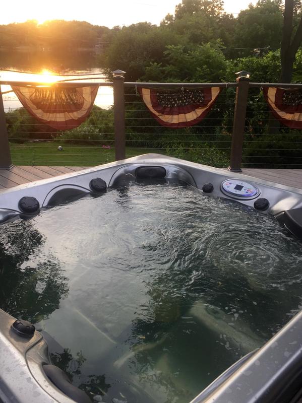 The sun setting over a lake couldn’t be more picturesque than it is from this hot tub. We love the deck railing that allows for clear views of the water, while nearby mature trees offer a sense of privacy.